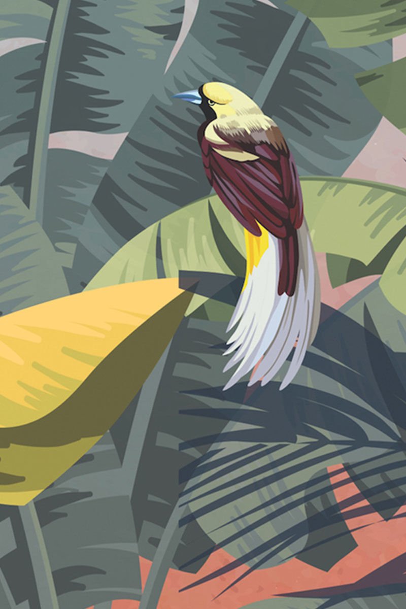 Sunset in paradiseSunset in paradise duvar kağıdı. Güneş batışında, devasa, capcanlı renkli tropikal yapraklar arasında, zarif kuşlar. Dekorunuza hareket katmak istiyorsanız bu duvar kağıdı sizin için doğru bir seçim olacaktır.TP07