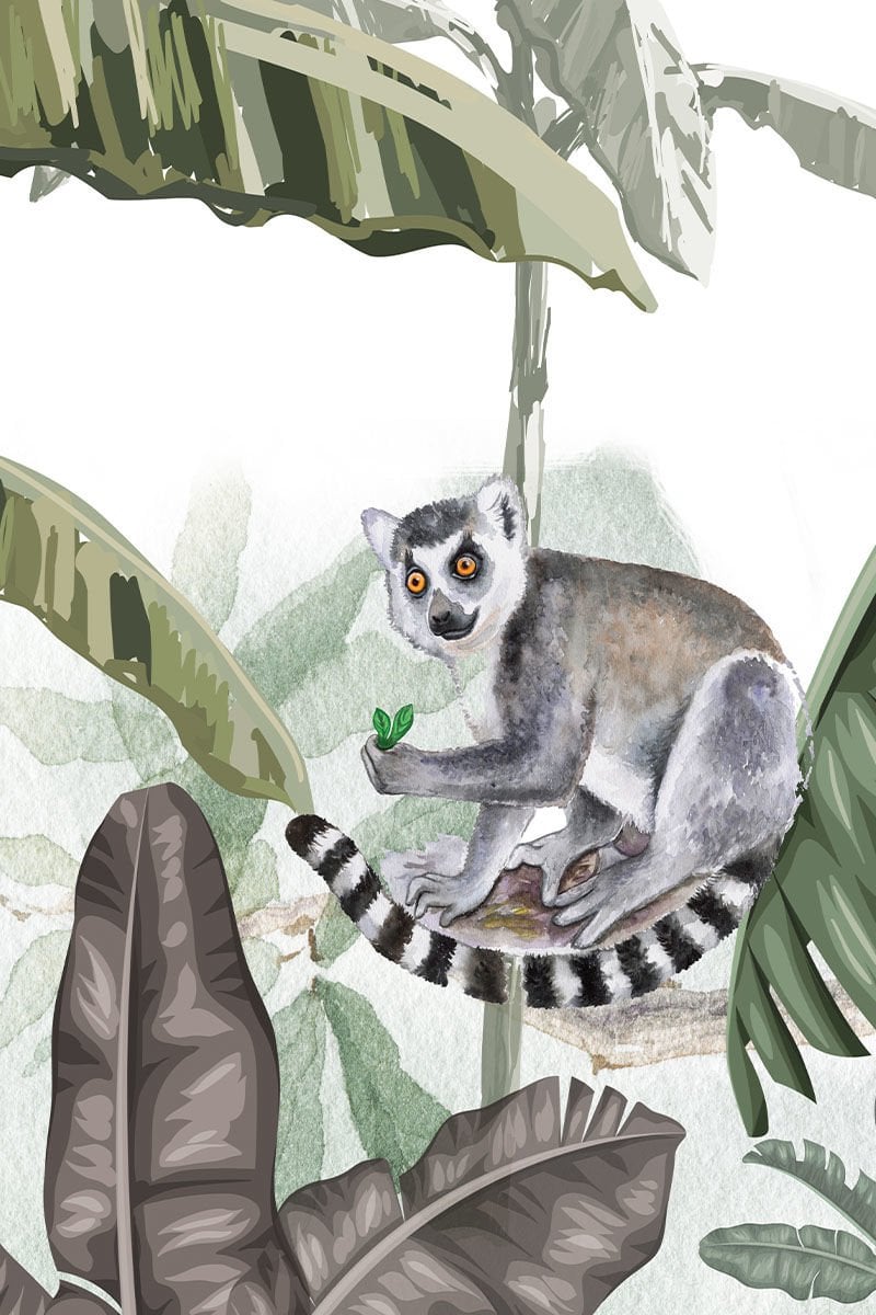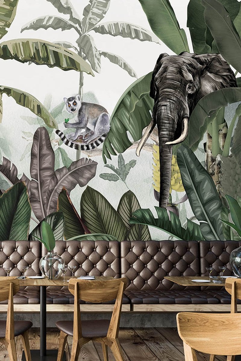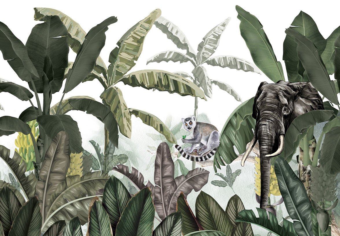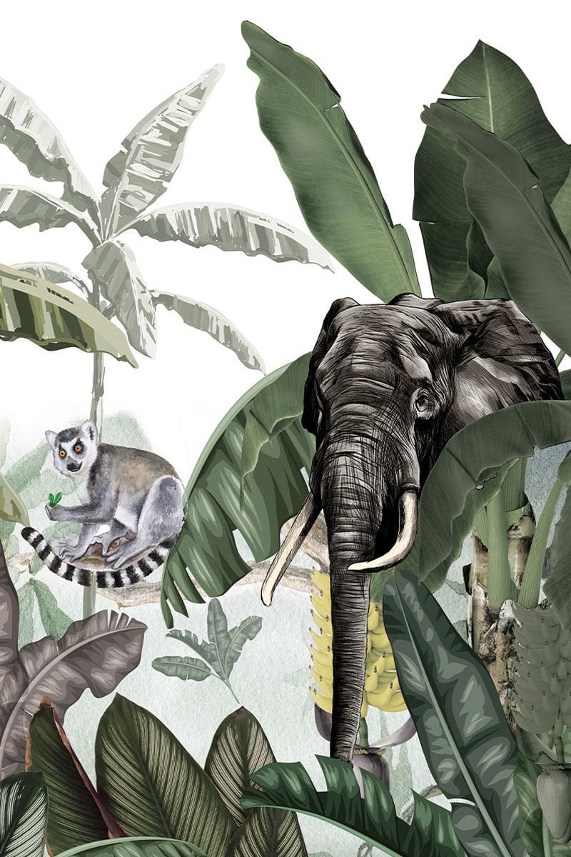 Tropical breezeTropical Breeze duvar kağıdı. Fil figürünün şans getirdiğine inanılır. Bir de her karşılaştığınızda yüzleri gülümseten lemuru düşünün. Tropikal yapraklar ardında beliren figürler sıcak ve keyifli bir rüzgarı evinize taşıyor.TP08