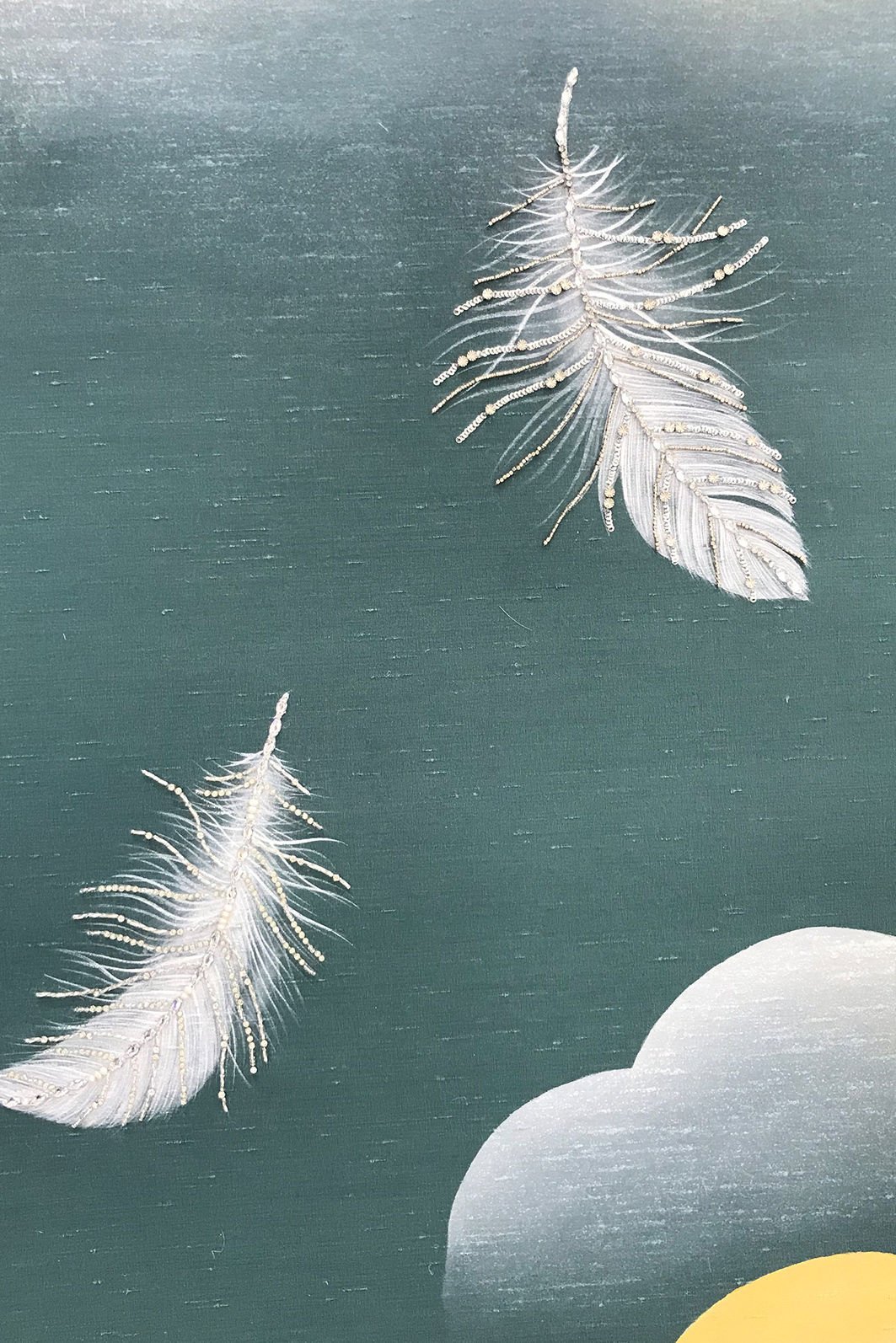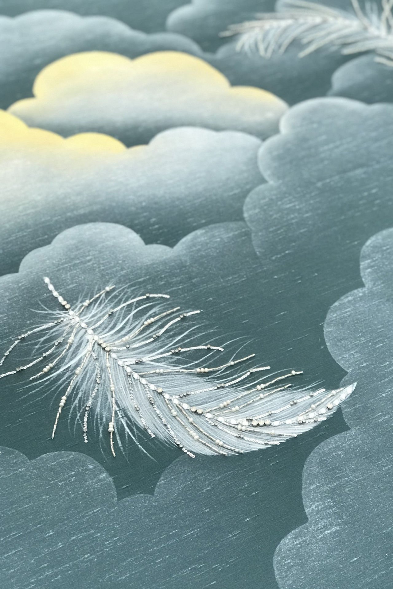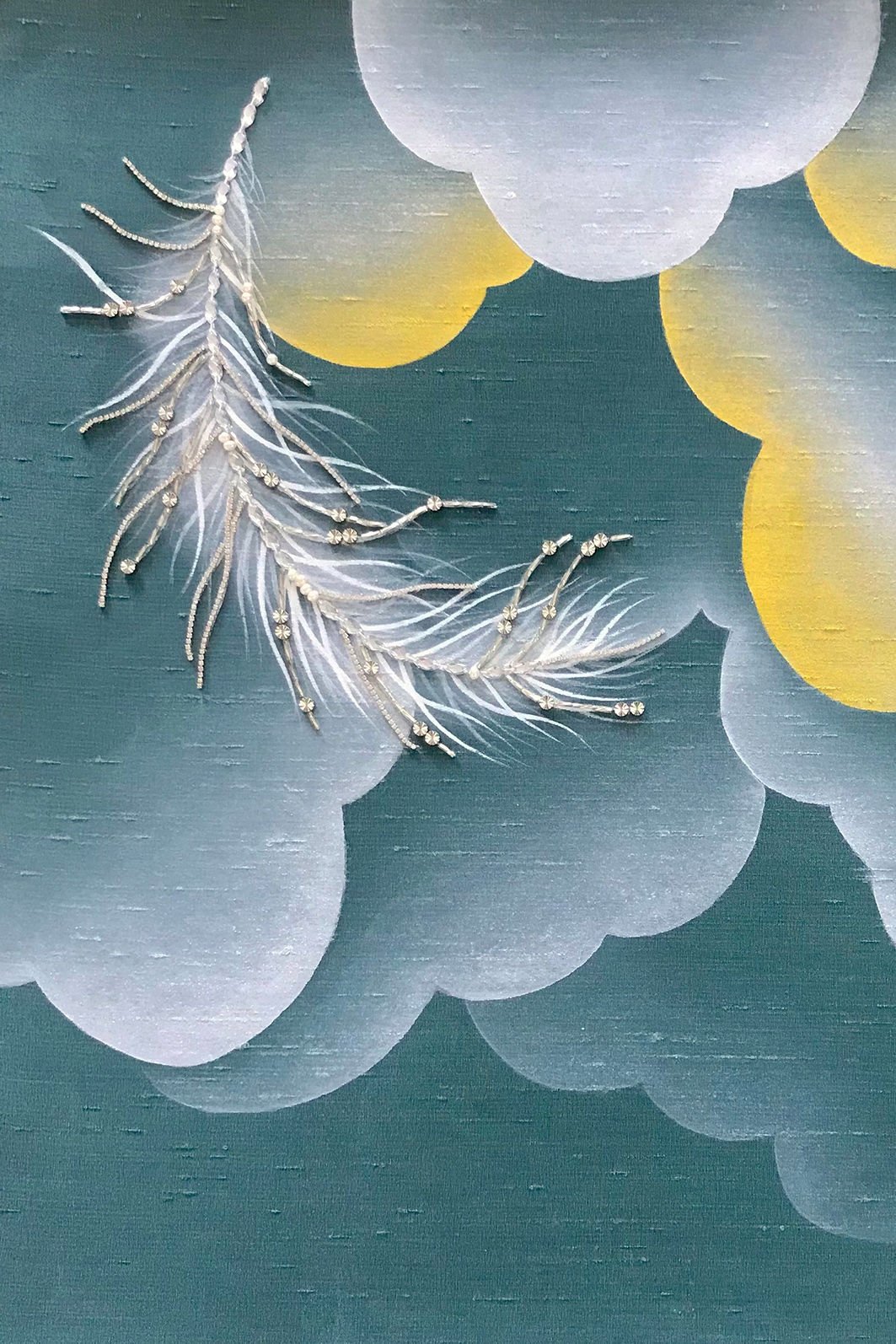 İpek üzerine elle boyanan, kabarık bulutların arasından süzülen tüyler, yetenekli zanaatkarlardan oluşan Lala Curıo atölyesinde gerçekleştirilen geleneksel “gong-bi” tablosunda titizlikle tasvir ediliyor.