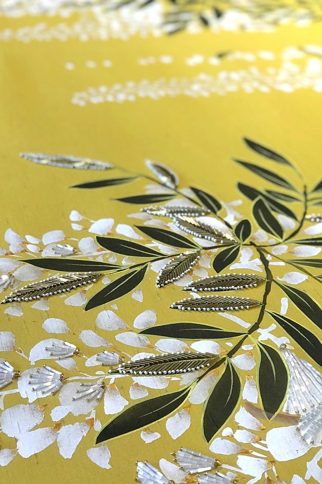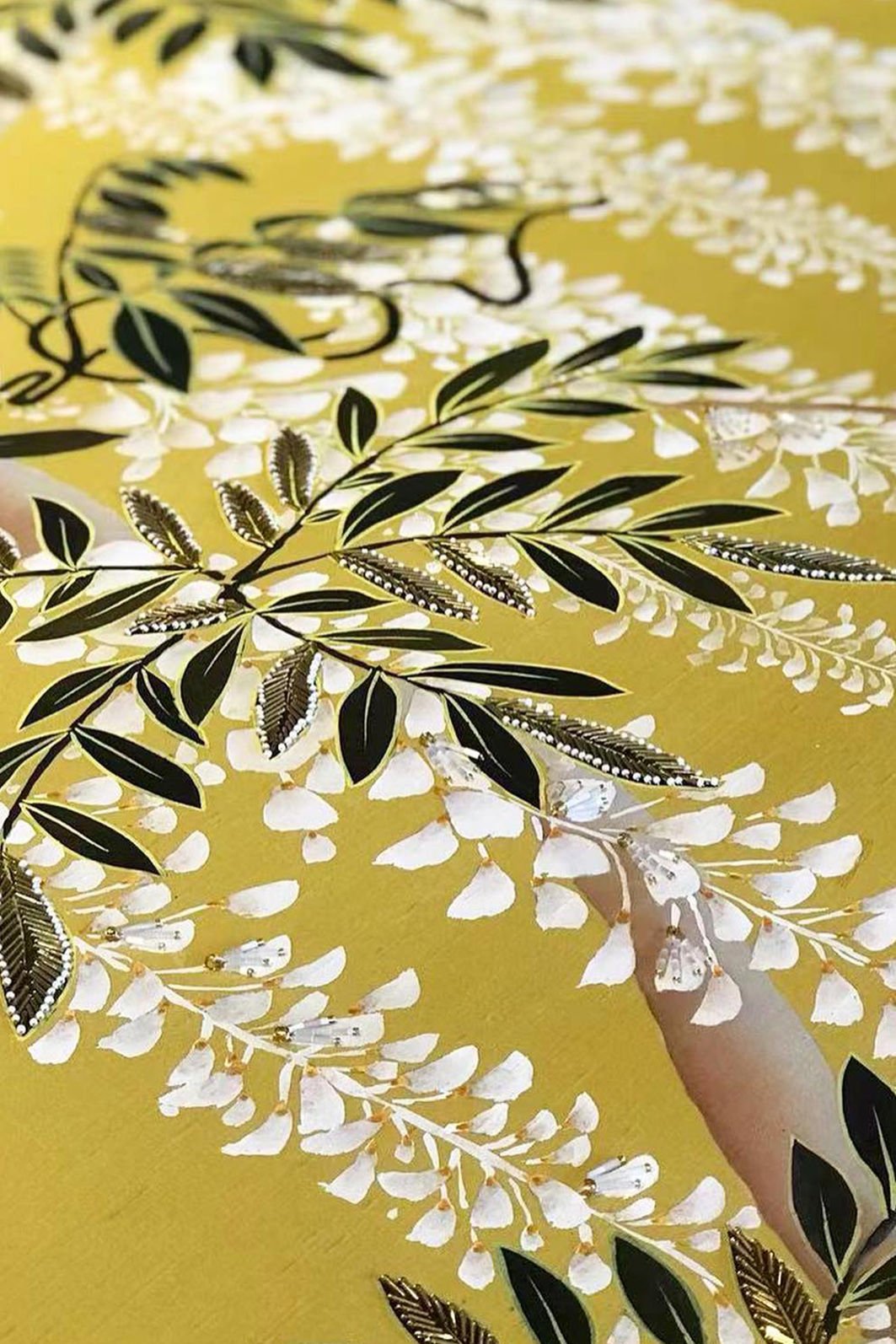 Wisteria palacePalazzo Lala Curio Wisteria: è finemente ricamato a mano su seta tailandese arricchita con ornamenti scintillanti e cattura la delicata bellezza dell'albero di glicine. Questo prodotto è prodotto interamente su ordine personalizzato.LC5