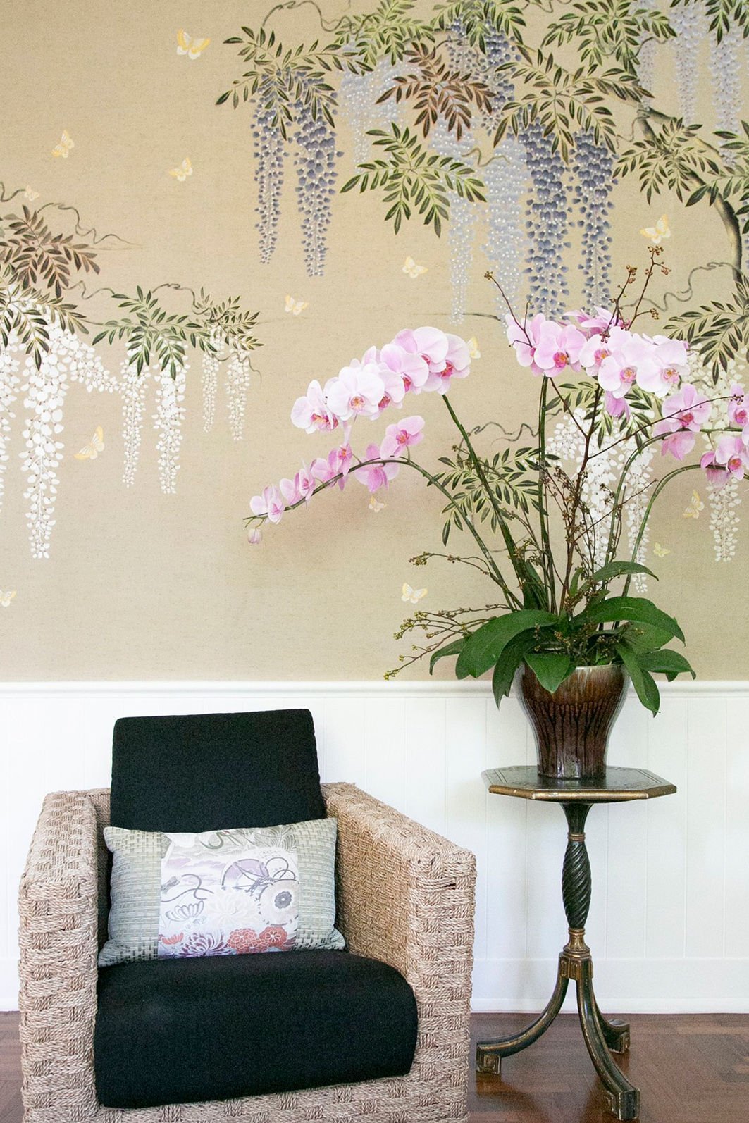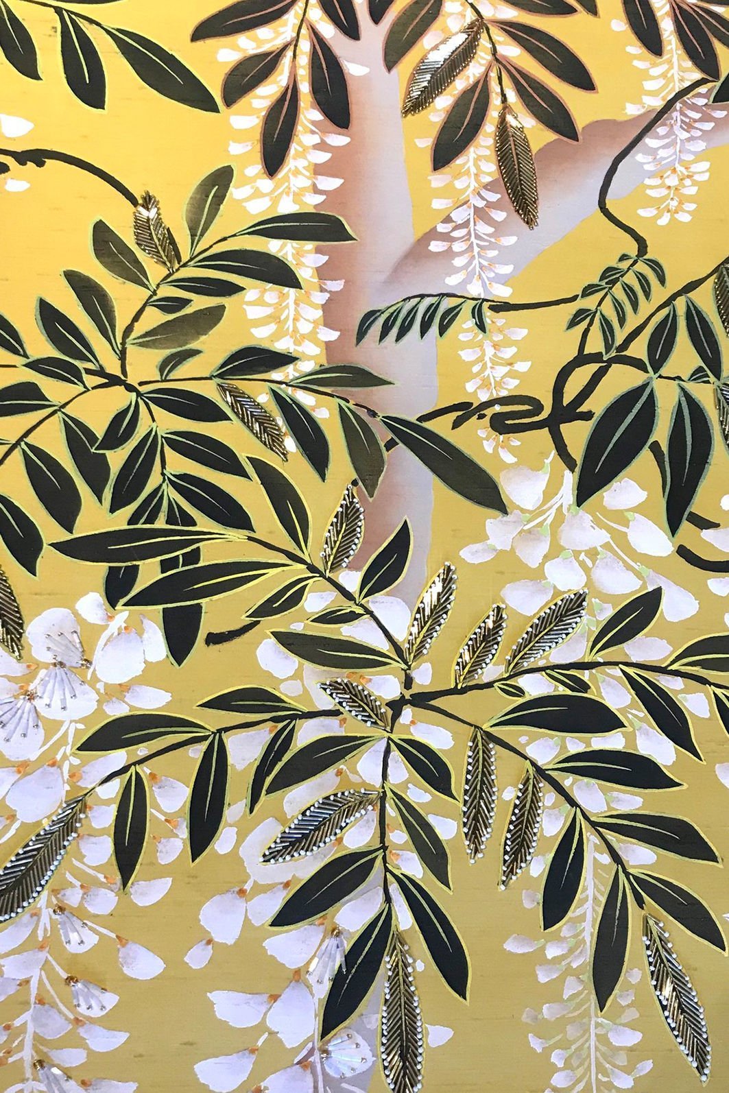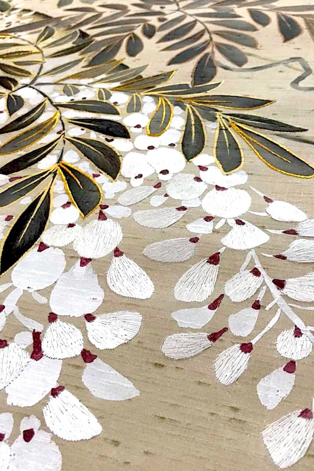 Palazzo del glicine: goccioline di foglie color malva pendono con grazia da viti robuste e contorte, raffiguranti il glicine, un simbolo romantico della poesia interculturale. Wisteria Palace è finemente ricamato a mano su seta tailandese arricchita con ornamenti scintillanti, catturando la delicata bellezza di questo bellissimo albero.